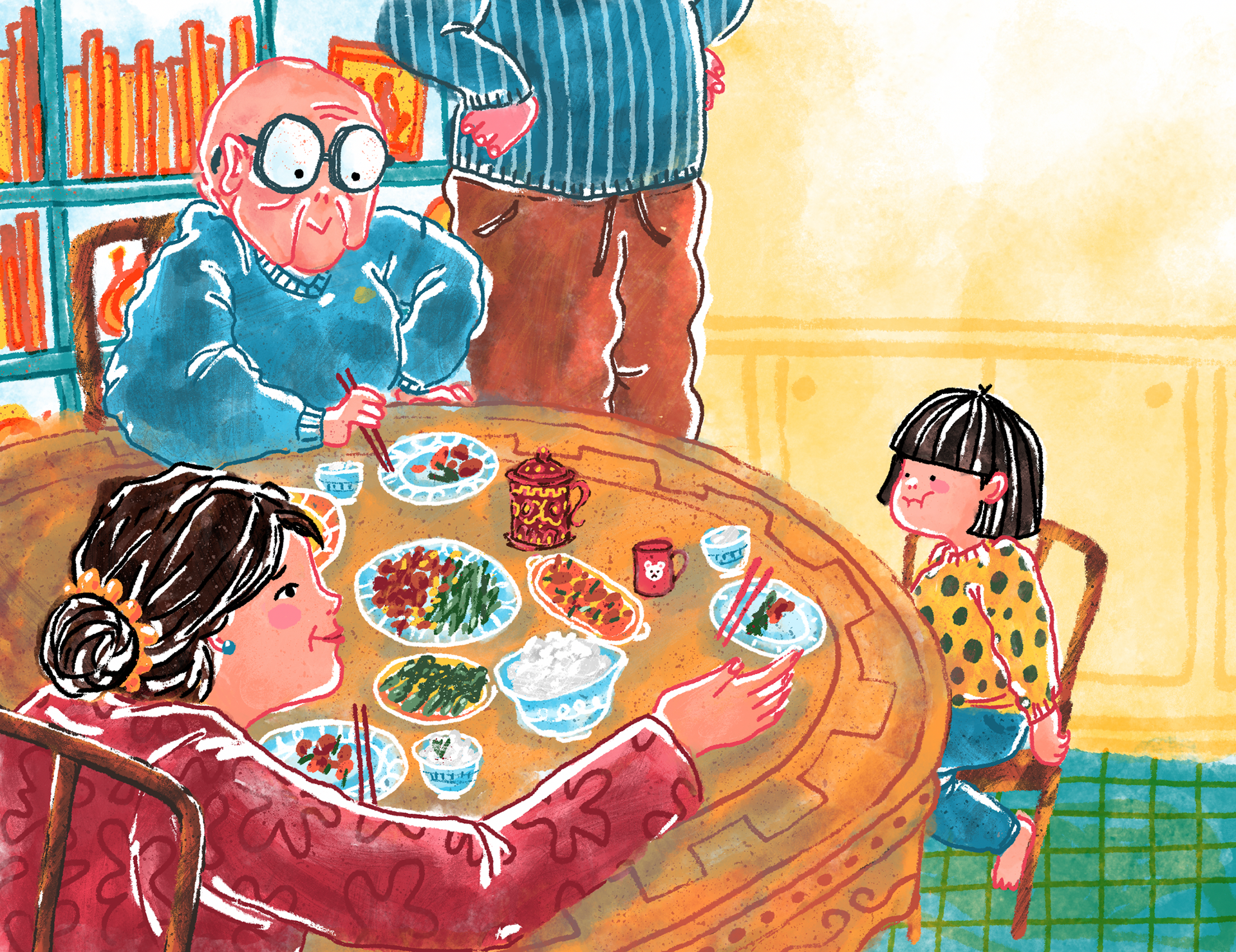 At dinner, Mama asks me to try again. Yéyé's chopsticks hover over his plate.